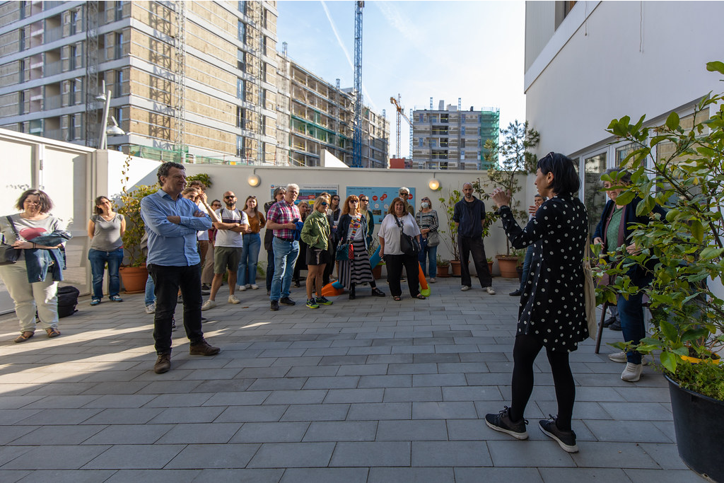 En el mismo barrio, también pudimos conocer el proyecto de 32 unidades de vivienda en régimen de cooperativa en cesión de uso. Un proyecto promovido por el Ayuntamiento de Barcelona a través de la cesión de suelo público y el desarrollo de un concurso de ideas para el diseño arquitectónico. La visita fue guiada por Pau Vidal, arquitecto parte del equipo redactor del proyecto, y por vecinas, habitantes de la comunidad cooperativa.